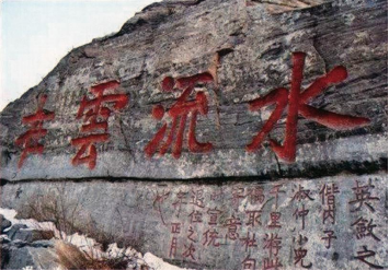 1913年2月,英斂之?dāng)y妻兒來到海澱區(qū)溫泉鎮(zhèn),信口吟詠起杜甫的詩:「坦腹江亭暖,長吟野望時。水流心不競,雲(yún)在意俱遲。」隨後,英斂之題寫榜書「水流雲(yún)在」四字,下面題註:「英斂之偕內(nèi)子淑仲小兒千里遊此偶取杜句寄意時宣統(tǒng)退位之次年正月也」。