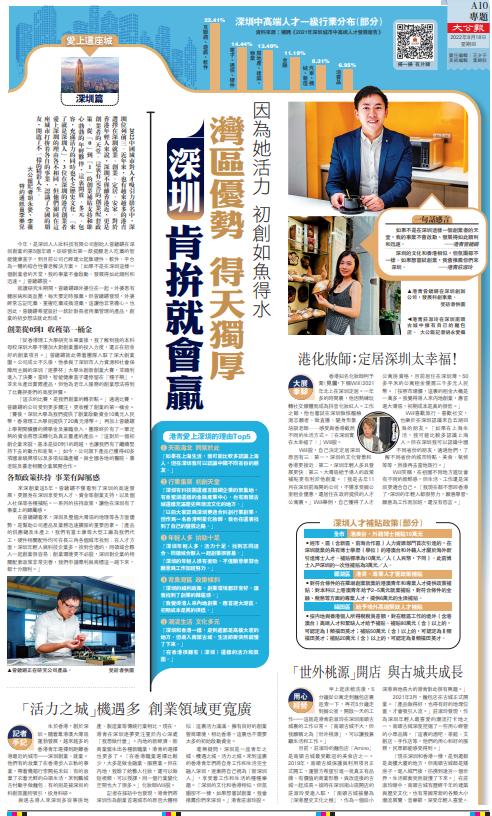 (大公報(bào)記者 胡永愛、李薇 特約通訊員 李樂兒)2022中國城市對人才吸引力排名中,深圳位列前三。近年來,也有越來越多的港青選擇在深圳就業(yè)、創(chuàng)業(yè)、定居、安家。對於香港年輕人來說,深圳不僅離香港近,更是創(chuàng)業(yè)者的天堂。這裏有完善的創(chuàng)業(yè)配套政策、從「0」到「1」的創(chuàng)業(yè)補(bǔ)貼支持和雄心勃勃的年輕夥伴,這裏開放、多元、包容,充滿活力的同時(shí)也不乏歷史文化?!竵砹司褪巧钲谌恕梗?位在深圳的港青創(chuàng)業(yè)者愛上深圳的理由各不相同,但他們卻同在這座城市打拚著各自的事業(yè),認(rèn)識了全國的朋友,開啟了不一樣的精彩人生。