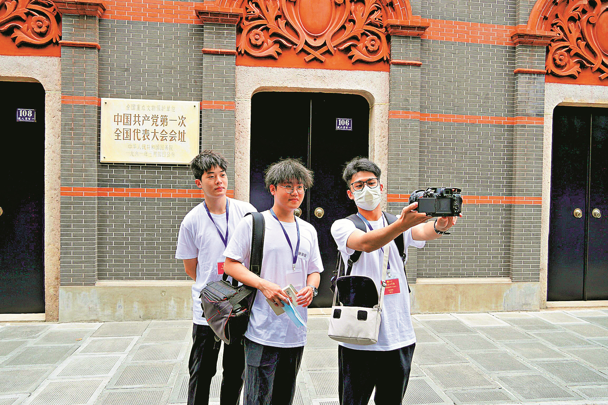 在採訪中,有同學(xué)表示自己由於太過興奮,抵達(dá)上海首日晚上失眠到凌晨,腦子裏還在考慮如何採訪好次日的活動。在一大紀(jì)念館,一個多小時的參觀中,大家紛紛拿出自備的相機(jī)、攝影機(jī)等,留下珍貴的瞬間。高溫、酷熱下採訪體力消耗極大,但是到了吃飯時,還有不少男生顧不得滿枱的食物,擦一擦汗水,就聚到旁邊的桌子上,拿出電腦和手機(jī),開始商量稿件和版面安排問題。同學(xué)們還表示,疫情以來,有這樣的採訪和實(shí)踐機(jī)會實(shí)在難得,必須好好珍惜。希望短短幾天,能夠貢獻(xiàn)出多一點(diǎn)精彩的版面。