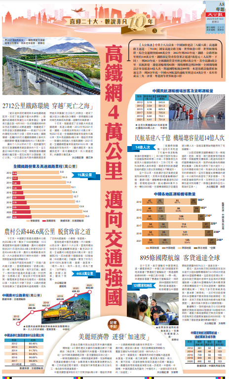 【大公報(bào)記者 應(yīng)江洪、譚旻煦、向蕓、方俊明】中共十八大以來,中國(guó)加快建設(shè)「八縱八橫」高速鐵路主通道、「71118」國(guó)家高速公路主線、世界級(jí)港口群、世界級(jí)機(jī)場(chǎng)群,綜合交通網(wǎng)突破600萬公里。2012年到2021年底,鐵路、公路增加里程約110萬公里,鐵路固定資產(chǎn)投資累計(jì)超過7萬億元(人民幣,下同)。到2021年底,全國(guó)鐵路營(yíng)業(yè)里程達(dá)到15萬公里,其中高鐵4萬公里。民航新建、遷建運(yùn)輸機(jī)場(chǎng)82個(gè),機(jī)場(chǎng)總數(shù)達(dá)到250個(gè),全國(guó)機(jī)場(chǎng)總設(shè)計(jì)容量超過14億人次,開通國(guó)際航線達(dá)895條。水運(yùn)基礎(chǔ)設(shè)施體系加速完善。到2021年底,中國(guó)內(nèi)河航道的通航里程達(dá)12.8萬公里,基本形成長(zhǎng)三角、津冀、粵港澳等世界級(jí)港口群。