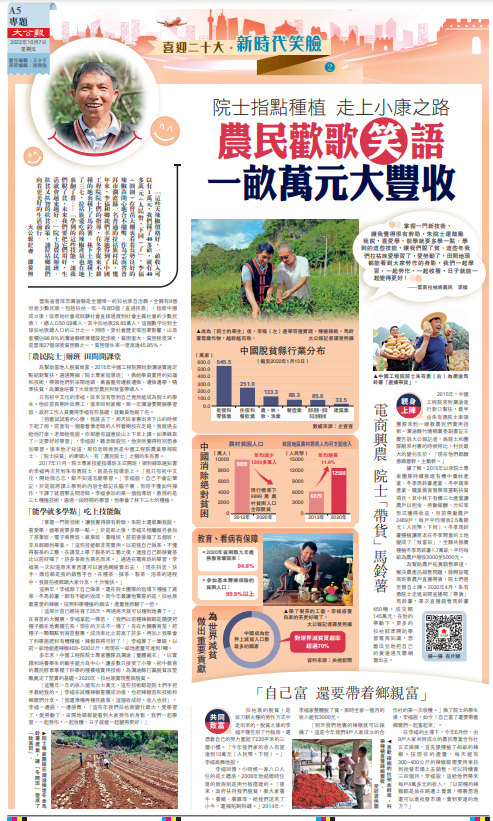(大公報記者 譚旻煦)「這些天辣椒價格好,一畝收入可以有1萬元,我們種了40多畝,就有40多萬元(人民幣,下同)了」,李福(圓圖)在育苗大棚裏看著長勢良好的辣椒苗開心地合不攏嘴。作為雲(yún)南省普洱市瀾滄縣一名普通的拉祜族村民,幾年來,李福和鄉(xiāng)親們幸運地得到了中國工程院院士們的指導(dǎo),在冬季從來不耕種的地裏種上了馬鈴薯、林下土地種上了三七,拉祜族愛吃的辣椒產(chǎn)量也在地裏翻了番……「學到的這些技能,讓我們脫了貧,未來我們要把它們用好,生活就會越來越好?!乖菏繛檗r(nóng)民辦班、扶貧又扶智的扶貧政策,讓拉祜鄉(xiāng)親們向著更美好的生活前行。