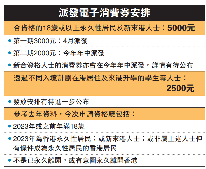 陳茂波表示,在過去兩年推行的兩輪消費券計劃,政府分別向超過600萬名合資格市民發(fā)放5000元及10000元電子消費券,社會反應(yīng)正面。今次再派發(fā)消費券,為了盡快發(fā)放,政府將先通過去年計劃的登記資料,在4月發(fā)放首階段的3000元給每名合資格的18歲或以上永久性居民及新來港人士,餘額2000元會與新符合資格人士一起在今年年中發(fā)放。
