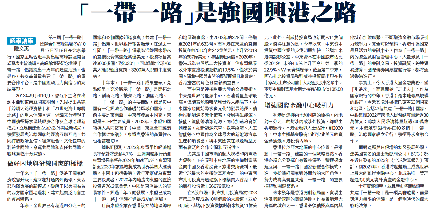香港位於亞太地區(qū)的中心位置,是推動「一帶一路」建設(shè)的一個戰(zhàn)略要點。香港必須充分發(fā)揮自身獨特優(yōu)勢,積極探索建立與「一帶一路」國家新型合作模式,進(jìn)一步扮演好國家對外開放的大門角色,努力成為高質(zhì)量共建「一帶一路」的重要樞紐和關(guān)鍵節(jié)點。