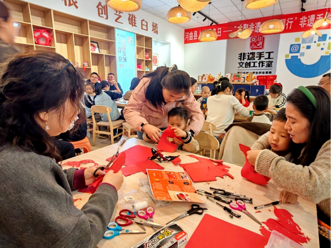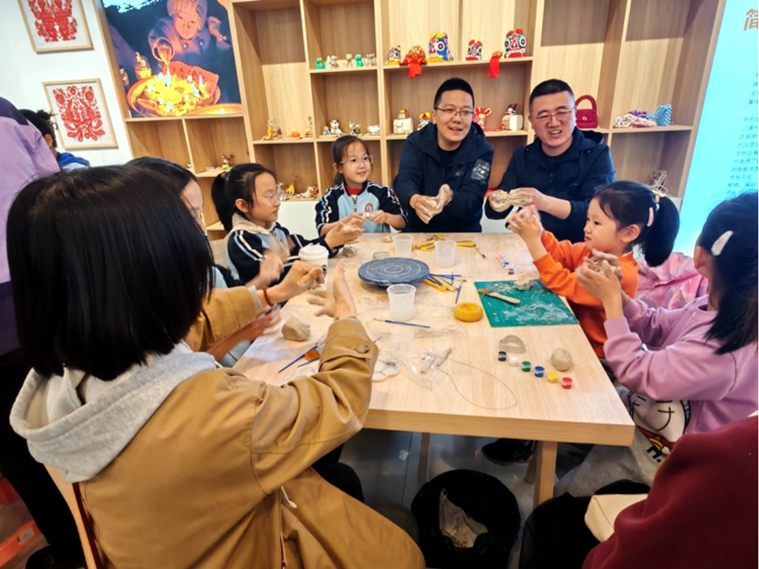 隨後,大家滿懷期待地來(lái)到非遺手工文創(chuàng)工作室,動(dòng)手體驗(yàn)?zāi)嗨芘c剪紙。非遺文化課堂邀請(qǐng)了專業(yè)非遺工匠現(xiàn)場(chǎng)傳授泥塑、剪紙技藝,並進(jìn)行指導(dǎo)。經(jīng)過(guò)揉捏、成型、修整、上色等一系列工序,孩子們與家長(zhǎng)一起將手中的泥巴變成一個(gè)個(gè)栩栩如生的泥塑作。普通的紅色紙張?jiān)诮?jīng)過(guò)摺疊、繪圖、剪修等步驟後也「搖身一變」,成為精美的螃蟹剪紙。在這個(gè)過(guò)程中,孩子們不僅深入了解豐富多樣的非遺手工文化,還近距離領(lǐng)略了河曲非遺的獨(dú)特魅力。