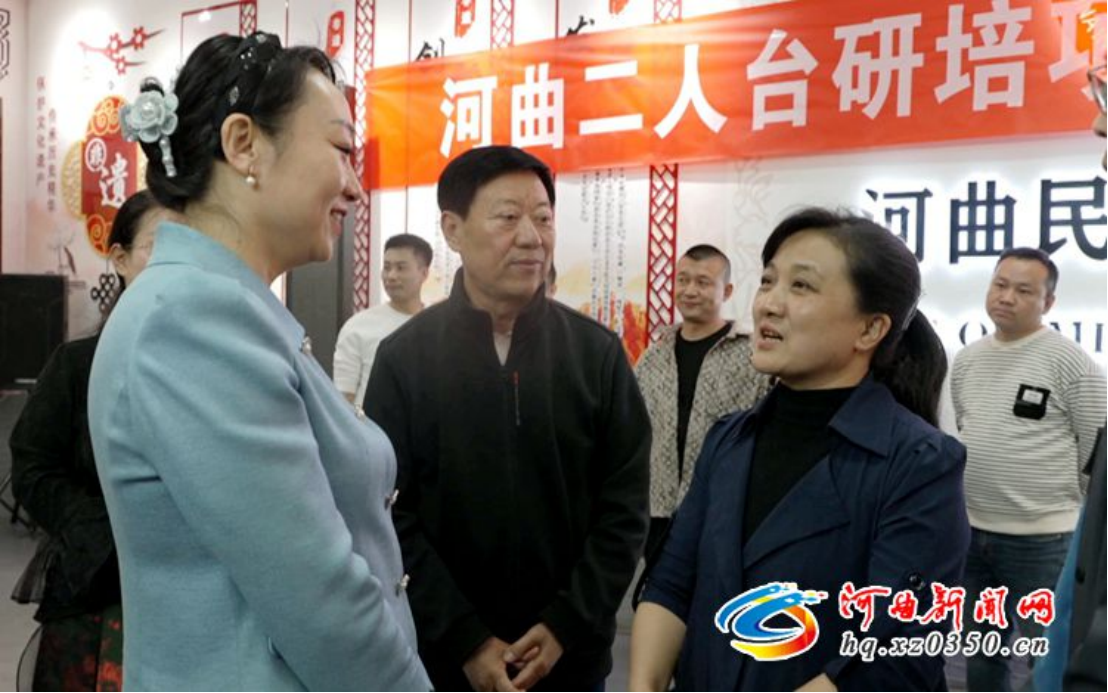 4月25日至26日,以「?jìng)鞒小す采ㄐ隆篂橹黝}的河曲二人臺(tái)非遺研培成果回訪活動(dòng)在河曲縣民歌二人臺(tái)藝術(shù)團(tuán)排練廳舉行?;顒?dòng)旨在總結(jié)非遺研培項(xiàng)目成果,深化校地合作,進(jìn)一步推動(dòng)河曲民歌二人臺(tái)的傳承與創(chuàng)新發(fā)展。