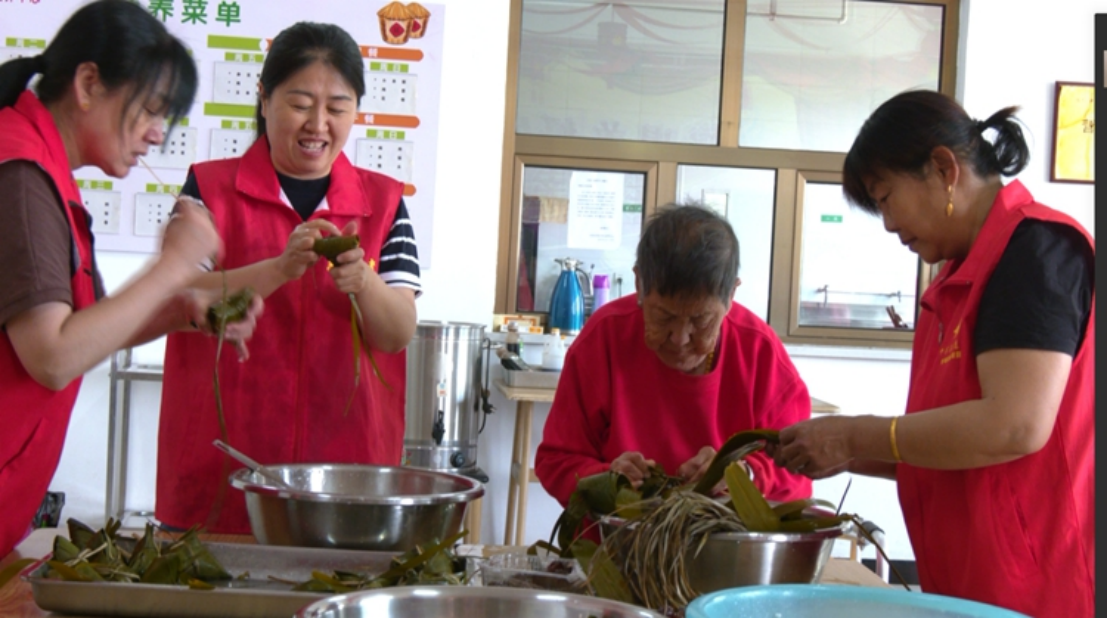志願者與老人們圍坐在一起,折粽葉、填糯米、扎繩結(jié),共同參與包粽子活動,用貼心陪伴為老人送去溫暖。