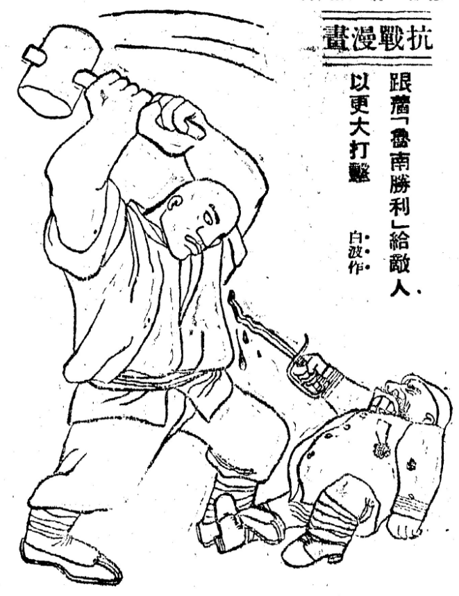 1938年4月10日,《大公報(bào)》漢口版刊登漫畫署名「白波」的漫畫,題款是「跟著『魯南勝利』給敵人以更大打擊」。當(dāng)時(shí),臺兒莊大捷,打破了日軍不可戰(zhàn)勝的神話,極大振奮了中國軍民的士氣信心。畫面中,壯碩的中國大漢,身著布鞋布衫,金剛怒目,高舉鎚頭,與猥瑣的日寇軍官形象,形成鮮明對比。