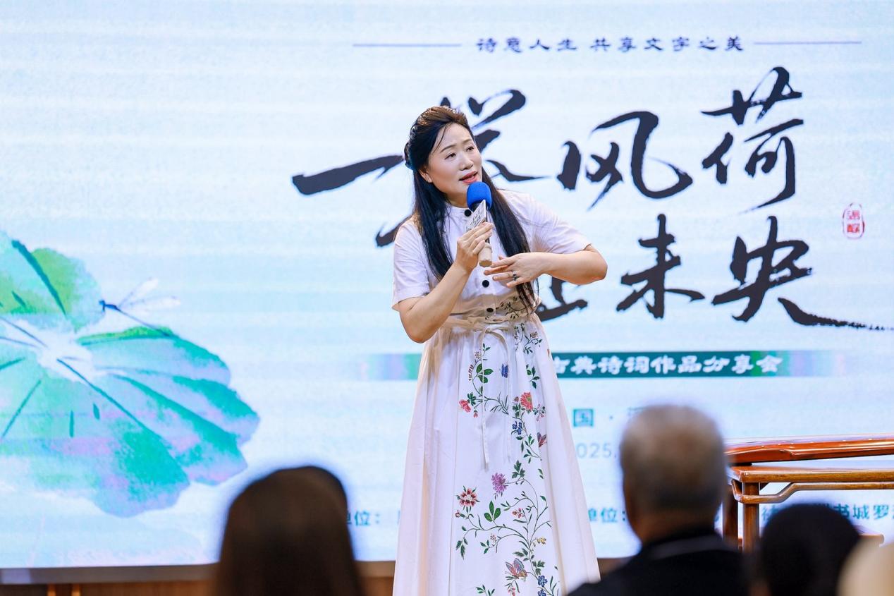 9月13日下午,「詩意人生 共享文字之美」張靜格律詩集《一舉風(fēng)荷正未央》作品分享會在深圳書城羅湖城舉辦。詩集《一舉風(fēng)荷正未央》近日由浙江文藝出版社出版,共收錄了張靜創(chuàng)作的300首詩歌,是作者多年對自然的認(rèn)知和對生活的感悟。分享會上,詩集作者張靜分享了創(chuàng)作心路歷程,演唱了崑曲《牡丹亭·尋夢·懶畫眉》,吟唱了詩經(jīng)中《關(guān)雎》,和詩詞愛好者互動、回答他們提出的問題,和主持人同臺吟誦作品,並向深圳書城羅湖城贈送簽名詩集,由書城專櫃收藏,最後向嘉賓和在書城購買詩集的詩詞愛好者簽名……整個活動流程豐富多彩,既傳承了中國古代的優(yōu)秀文化,又展現(xiàn)了張靜多才多藝的風(fēng)采,給與會者和網(wǎng)上觀看直播的網(wǎng)友留下深刻印象。